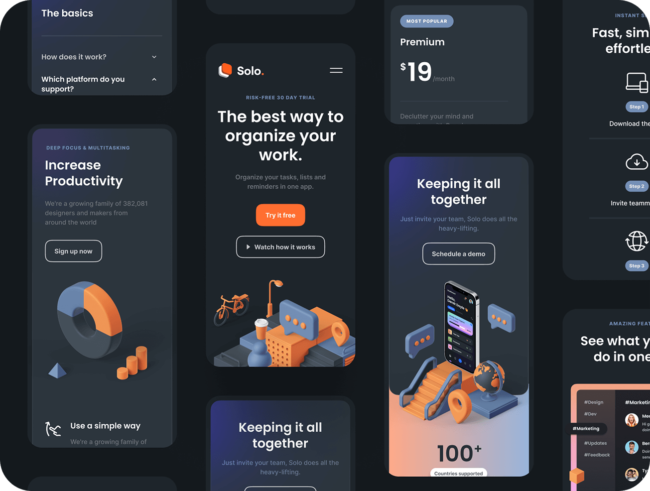 Solo is a conceptual landing page for a productivity and task management platform designed to help teams organize work, collaborate efficiently, and stay focused across devices. The goal of this project was to create a modern, clear, and conversion-oriented interface that communicates product value quickly while maintaining a strong visual identity.